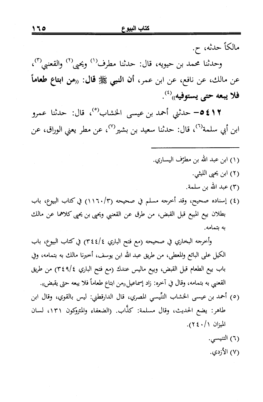 -[166]- نافع، عن ابن عمر قال: "أمرنا رسول الله -صلى الله عليه وسلم- إذا اشترينا الطعام أن لا نبيعه حتى نقبضه" (¬4).