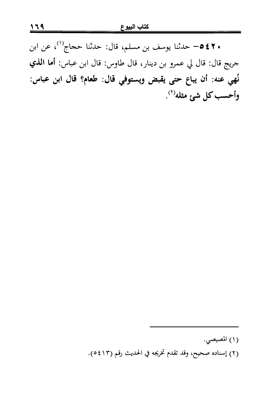 5420 - حدثنا يوسف بن مسلم، قال: حدثنا حجاج (¬1)، عن ابن جريج قال: قال لي عمرو بن دينار، قال طاوس: قال ابن عباس: أما الذي نُهي عنه: أن يباع حتى يقبض ويستوفي قال: طعام؟ قال ابن عباس: وأحسب كل شيء مثله (¬2).
