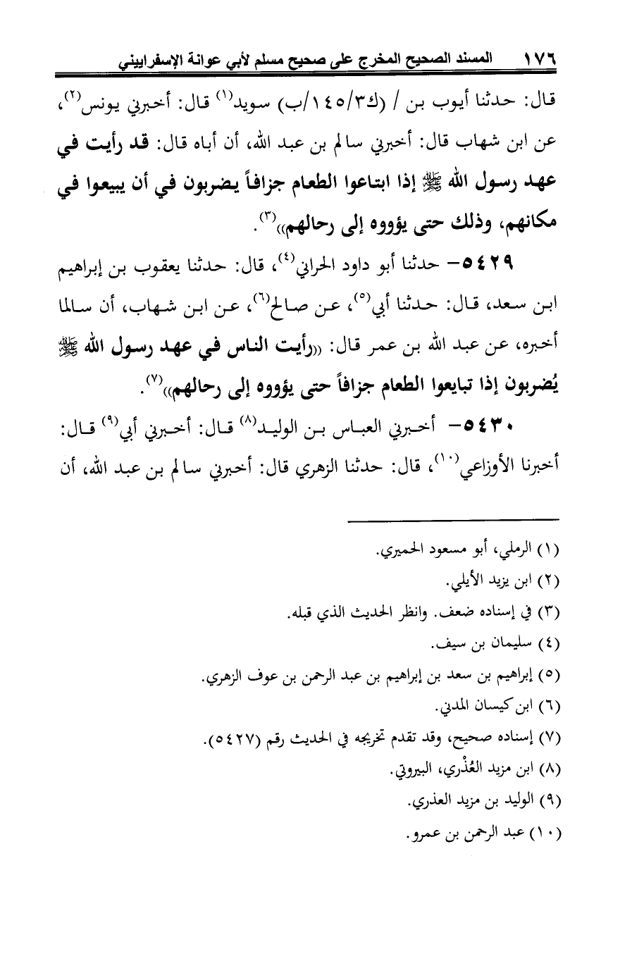 5429 - حدثنا أبو داود الحراني (¬1)، قال: حدثنا يعقوب بن إبراهيم ابن سعد، قال: حدثنا أبي (¬2)، عن صالح (¬3)، عن ابن شهاب، أن سالما أخبره، عن عبد الله بن عمر قال: "رأيت الناس في عهد رسول الله -صلى الله عليه وسلم- يُضربون إذا تبايعوا الطعام جزافًا حتى يؤووه إلى رحالهم" (¬4).