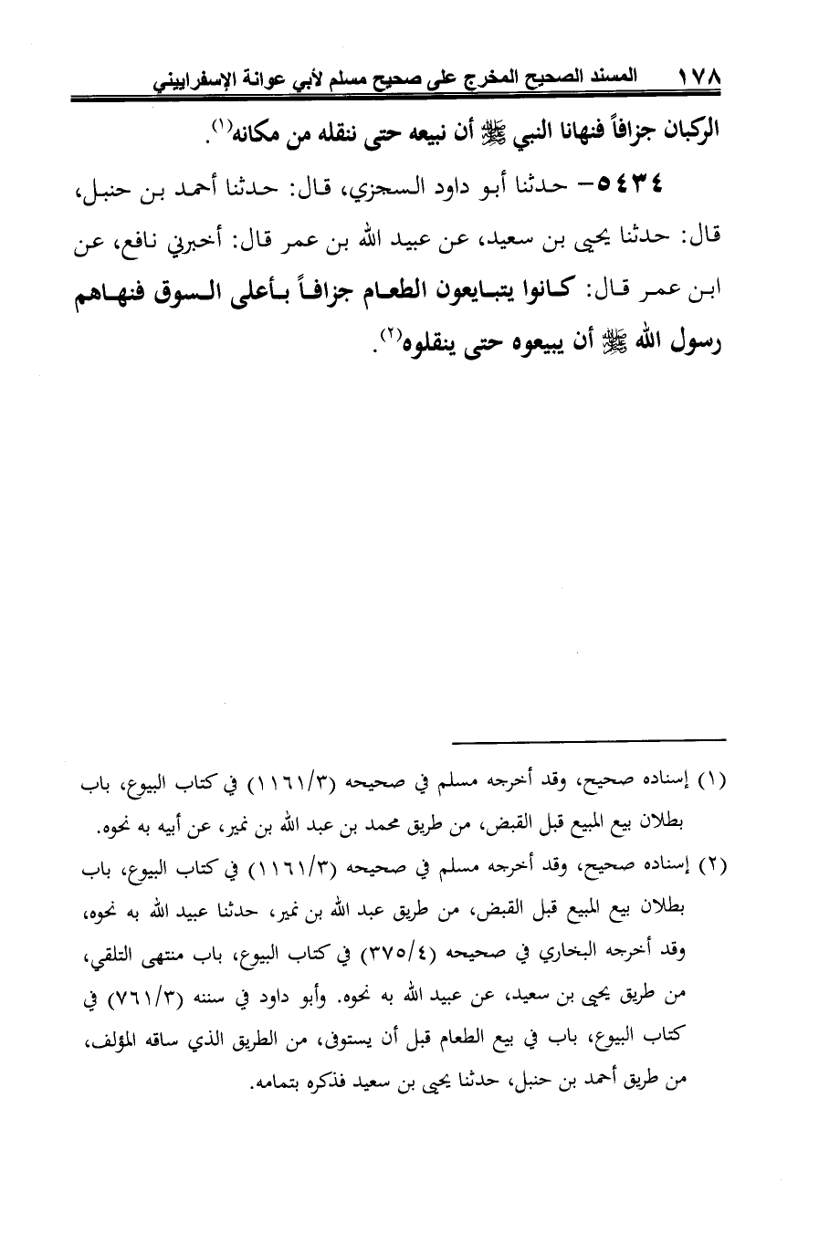 5434 - حدثنا أبو داود السجزي، قال: حدثنا أحمد بن حنبل، قال: حدثنا يحيى بن سعيد، عن عبيد الله بن عمر قال: أخبرني نافع، عن ابن عمر قال: كانوا يتبايعون الطعام جزافًا بأعلى السوق فنهاهم رسول الله -صلى الله عليه وسلم- أن يبيعوه حتى ينقلوه (¬1).