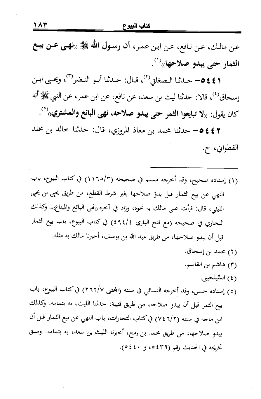 5441 - حدثنا الصغاني (¬1)، قال: حدثنا أبو النضر (¬2)، ويحيى ابن إسحاق (¬3)، قالا: حدثنا ليث بن سعد، عن نافع، عن ابن عمر، عن النبي -صلى الله عليه وسلم- أنه كان يقول: "لا تبايعوا الثمر حتى يبدو صلاحه، نهى البائع والمشتري" (¬4).