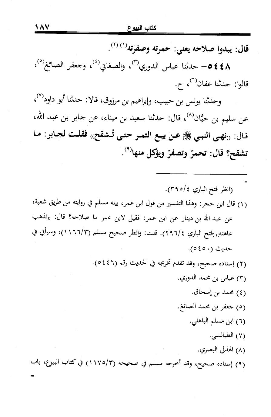 وحدثنا يونس بن حبيب، وإبراهيم بن مرزوق، قالا: حدثنا أبو داود (¬5)، عن سليم بن حيَّان (¬6)، قال: حدثنا سعيد بن ميناء، عن جابر بن عبد الله، قال: "نهى النبي -صلى الله عليه وسلم- عن بيع الثمر حتى تُشقح" فقلت لجابر: ما تشقح؟ قال: تحمرّ وتصفرّ ويؤكل منها (¬7).