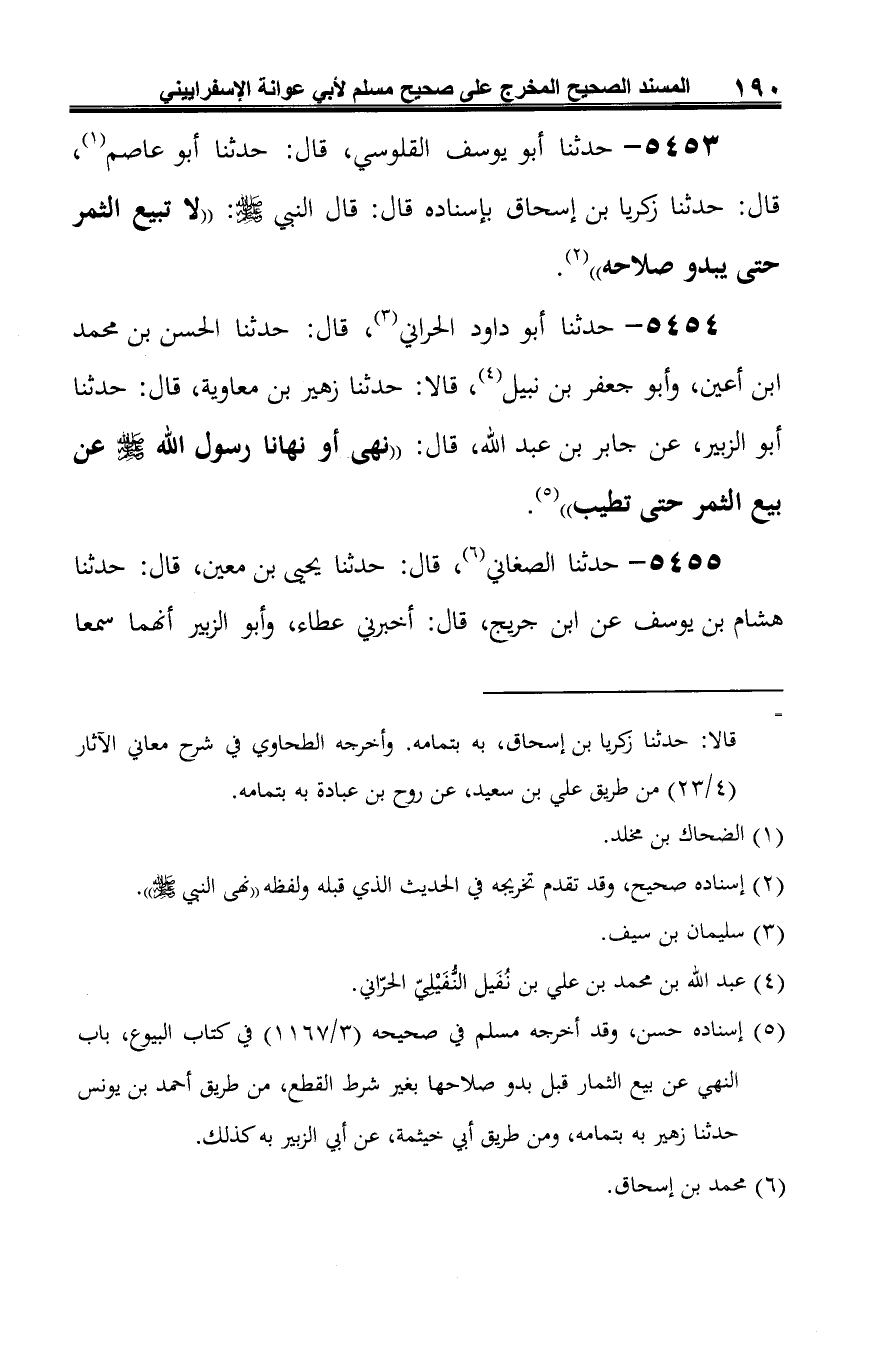 5454 - حدثنا أبو داود الحراني (¬1)، قال: حدثنا الحسن بن محمد ابن أعين، وأبو جعفر بن نبيل (¬2)، قالا: حدثنا زهير بن معاوية، قال: حدثنا أبو الزبير، عن جابر بن عبد الله، قال: "نهى أو نهانا رسول الله -صلى الله عليه وسلم- عن بيع الثمر حتى تطيب" (¬3).