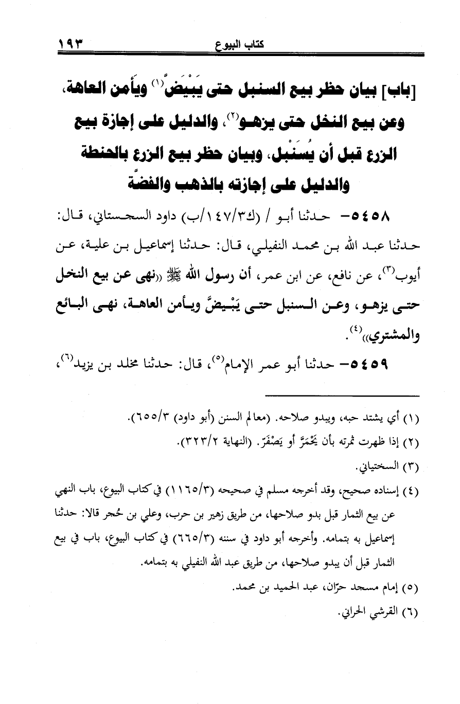 5458 - حدثنا أبو داود السجستاني، قال: حدثنا عبد الله بن محمد النفيلي، قال: حدثنا إسماعيل بن علية، عن أيوب (¬1)، عن نافع، عن ابن عمر، أن رسول الله -صلى الله عليه وسلم- "نهي عن بيع النخل حتى يزهو، وعن السنبل حتى يَبْيضَّ ويأمن العاهة، نهي البائع والمشتري" (¬2).