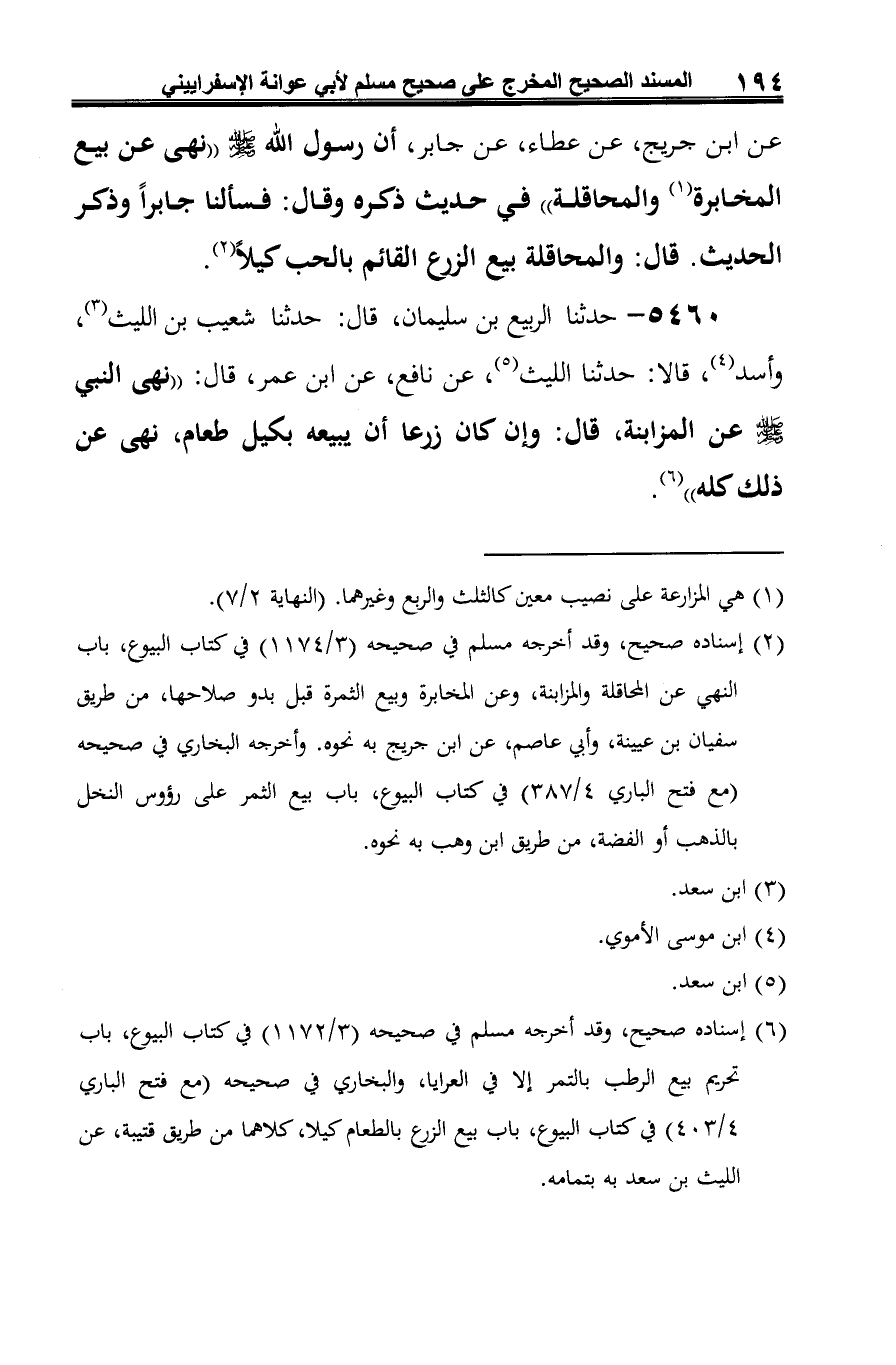 5460 - حدثنا الربيع بن سليمان، قال: حدثنا شعيب بن الليث (¬1)، وأسد (¬2)، قالا: حدثنا الليث (¬3)، عن نافع، عن ابن عمر، قال: "نهي النبي -صلى الله عليه وسلم- عن المزابنة، قال: وإن كان زرعا أن يبيعه بكيل طعام، نهي عن ذلك كله" (¬4).