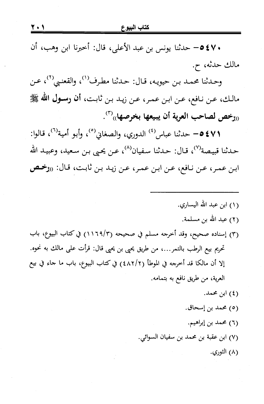 5471 - حدثنا عباس (¬1) الدوري، والصغاني (¬2)، وأبو أمية (¬3)، قالوا: حدثنا قبيصة (¬4)، قال: حدثنا سفيان (¬5)، عن يحيى بن سعيد، وعبيد الله ابن عمر، عن نافع، عن ابن عمر، عن زيد بن ثابت، قال: "رخص