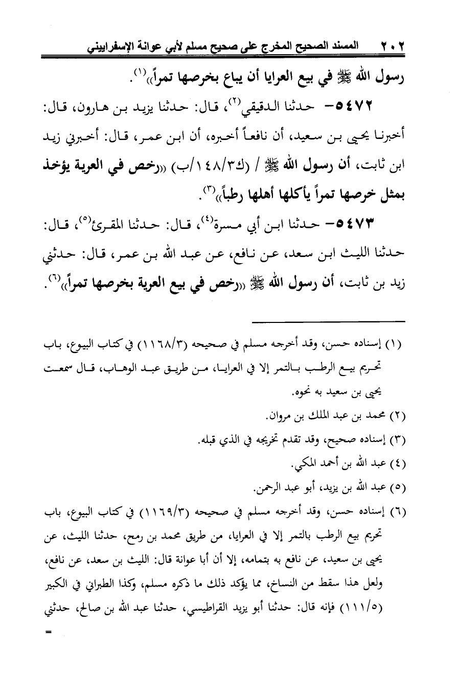 (¬3) إسناده حسن، وقد أخرجه مسلم في صحيحه (3/ 1169) في كتاب البيوع، باب تحريم بيع الرطب بالتمر إلا في العرايا، من طريق محمد بن رمح، حدثنا الليث، عن يحيى بن سعيد، عن نافع به بتمامه، إلا أن أبا عوانة قال: الليث بن سعد، عن نافع، ولعل هذا سقط من النساخ، مما يؤكد ذلك ما ذكره مسلم، وكذا الطبراني في الكبير (5/ 111) فإنه قال: حدثنا أبو يزيد القراطيسي، حدثنا عبد الله بن صالح، حدثني =