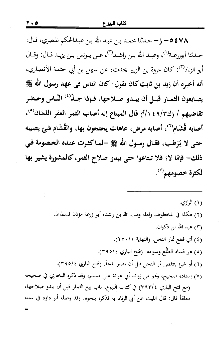 5478 - ز- حدثنا محمد بن عبد الله بن عبد الحكم المصري، قال: حدثنا أبو زرعة (¬1)، وعبد الله بن راشد (¬2)، عن يونس بن يزيد قال: وقال أبو الزناد (¬3): كان عروة بن الزبير يحدث، عن سهل بن أبي حثمة الأنصاري، أنه أخبره أن زيد بن ثابت كان يقول: كان الناس في عهد رسول الله -صلى الله عليه وسلم- يتبايعون الثمار قبل أن يبدو صلاحها، فإذا جذّ (¬4) النَّاس وحضر تقاضيهم قال المبتاع إنه أصاب الثمر العقر الذمَان (¬5)، أصابه قُشَام (¬6)، أصابه مرض، عاهات يحتجون بها، والقُشَام شيء يصيبه حتى لا يُرَطب، فقال رسول الله -صلى الله عليه وسلم- لما كثرت عنده الخصومة في ذلك -فإمّا لا؛ فلا تبتاعوا حتى يبدو صلاح الثمر، كالمشورة يشير بها لكثرة خصومهم (¬7).