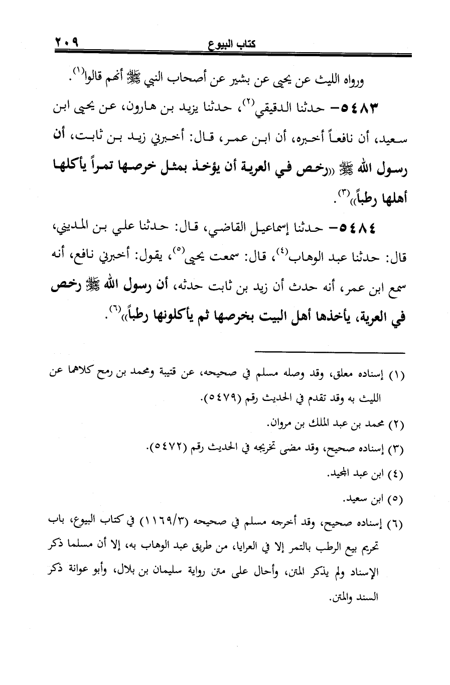 5483 - حدثنا الدقيقي (¬1)، حدثنا يزيد بن هارون، عن يحيى ابن سعيد، أن نافعًا أخبره، أن ابن عمر، قال: أخبرني زيد بن ثابت، أن رسول الله -صلى الله عليه وسلم- "رخص في العرية أن يؤخذ بمثل خرصها تمرًا يأكلها أهلها رطبًا" (¬2).