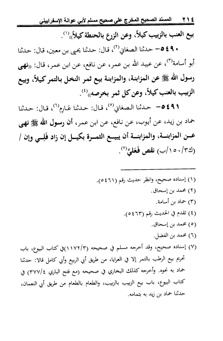 5491 - حدثنا الصغاني (¬1)، قال: حدثنا عَارِم (¬2)، قال: حدثنا حماد بن زيد، عن أيوب، عن نافع، عن ابن عمر، أن رسول الله -صلى الله عليه وسلم- نهي عن المزابنة، والمزابنة أن يبيع الثمرة بكيل إن زاد فَلِي وإن نقص فَعَليَّ (¬3).