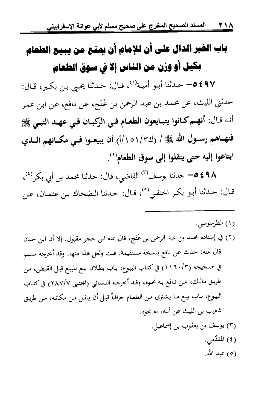 5497 - حدثنا أبو أمية (¬1)، قال: حدثنا يحيى بن بكير، قال: حدثني الليث، عن محمد بن عبد الرحمن بن غَنَج، عن نافع، عن ابن عمر أنه قال: أنهم كانوا يتبايعون الطعام في الركبان في عهد النبي -صلى الله عليه وسلم- فنهاهم رسول الله -صلى الله عليه وسلم- أن يبيعوا في مكانهم الذي ابتاعوا إليه حتى ينقلوا إلى سوق الطعام (¬2).