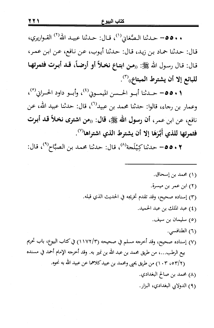 5501 - حدثنا أبو الحسن الميموني (¬1)، وأبو داود الحراني (¬2)، وعمار بن رجاء، قالوا: حدثنا محمد بن عبيد (¬3)، قال: حدثنا عبيد الله، عن نافع، عن ابن عمر، أن رسول الله -صلى الله عليه وسلم-، قال: "من اشترى نخلًا قد أبرت فثمرتها للذي أَبَّرَهَا إلا أن يشترط الذي اشتراها (¬4).