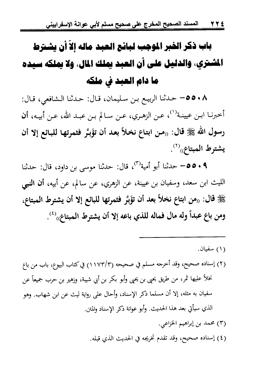 5509 - حدثنا أبو أمية (¬1)، قال: حدثنا موسى بن داود، قال: حدثنا الليث ابن سعد، وسفيان بن عيينة، عن الزهري، عن سالم، عن أبيه، أن النبي -صلى الله عليه وسلم- قال: "من ابتاع نخلًا بعد أن تؤَبَّر فثمرتها للبائع إلا أن يشترط المبتاع، ومن باع عبدًا وله مال فماله للذي باعه إلا أن يشترط المبتاع" (¬2).
