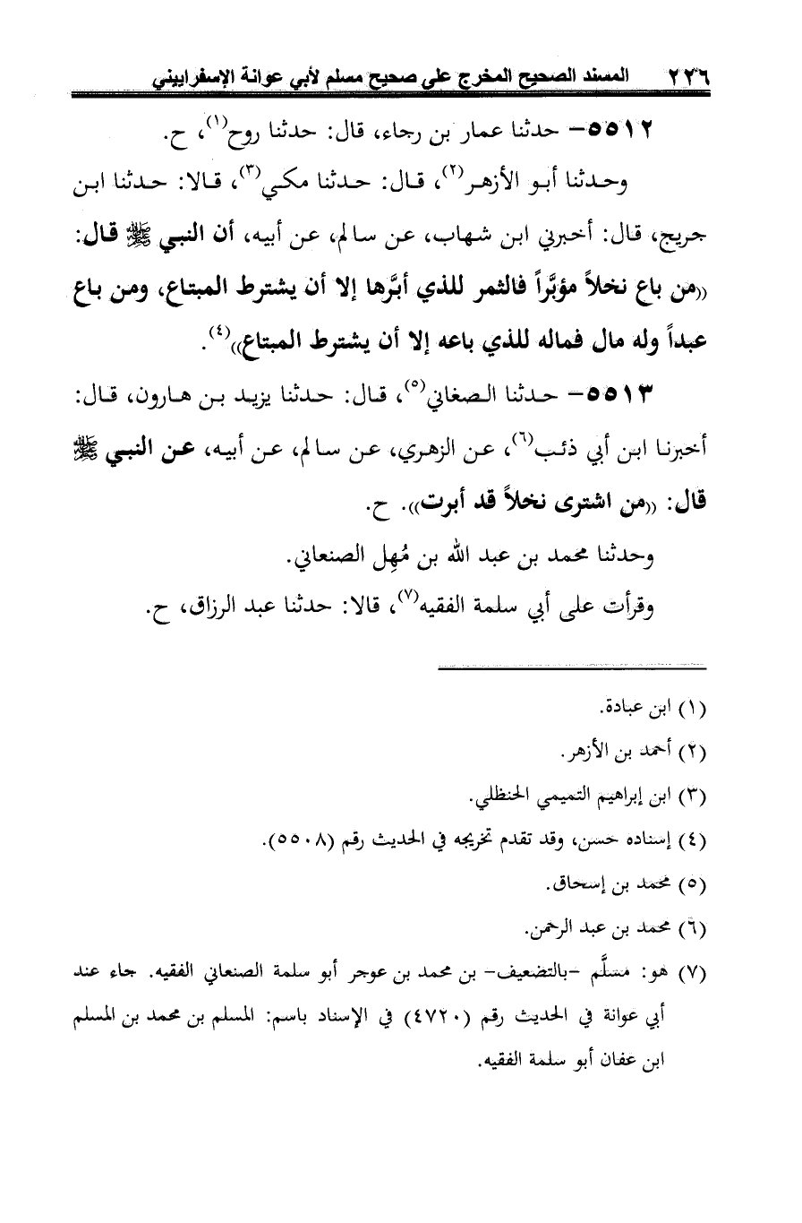 5513 - حدثنا الصغاني (¬1)، قال: حدثنا يزيد بن هارون، قال: أخبرنا ابن أبي ذئب (¬2)، عن الزهري، عن سالم، عن أبيه، عن النبي -صلى الله عليه وسلم- قال: "من اشترى نخلًا قد أبرت". ح.