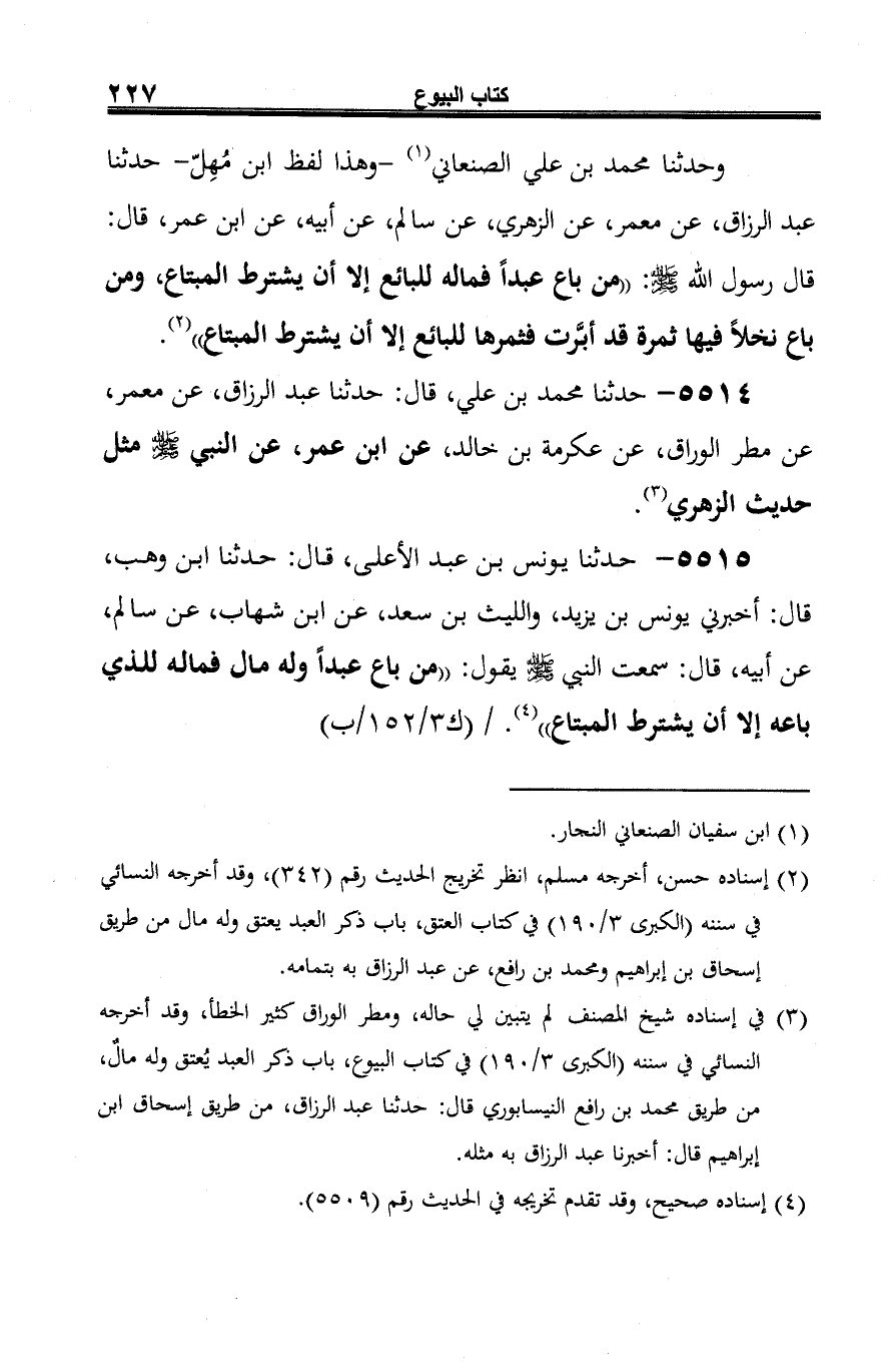 5515 - حدثنا يونس بن عبد الأعلى، قال: حدثنا ابن وهب، قال: أخبرني يونس بن يزيد، والليث بن سعد، عن ابن شهاب، عن سالم، عن أبيه، قال: سمعت النبي -صلى الله عليه وسلم- يقول: "من باع عبدًا وله مال فماله للذي باعه إلا أن يشترط المبتاع" (¬1).