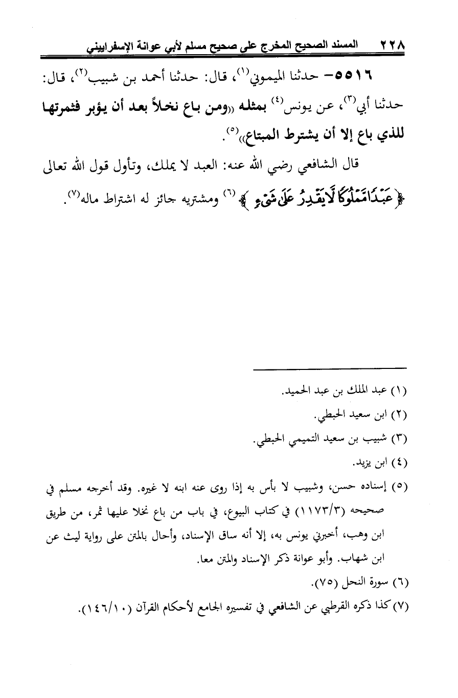 (¬5) إسناده حسن، وشبيب لا بأس به إذا روى عنه ابنه لا غيره. وقد أخرجه مسلم في صحيحه (3/ 1173) في كتاب البيوع، في باب من باع نخلا عليها ثمر، من طريق ابن وهب، أخبرني يونس به، إلا أنه ساق الإسناد، وأحال بالمتن على رواية ليث عن ابن شهاب. وأبو عوانة ذكر الإسناد والمتن معا.