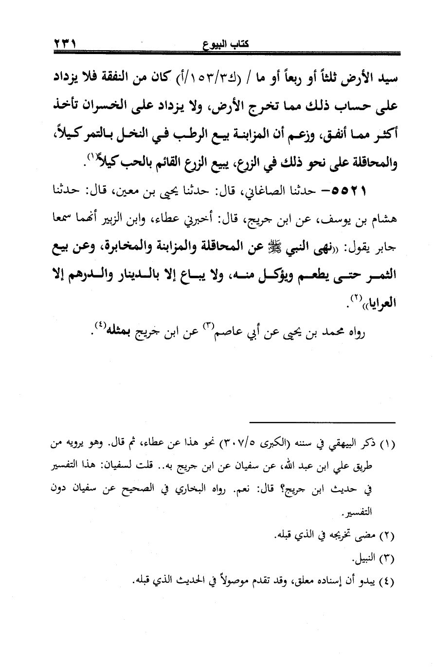 5521 - حدثنا الصاغاني، قال: حدثنا يحيى بن معين، قال: حدثنا هشام بن يوسف، عن ابن جريج، قال: أخبرني عطاء، وابن الزبير أنهما سمعا جابر يقول: "نهي النبي -صلى الله عليه وسلم- عن المحاقلة والمزابنة والمخابرة، وعن بيع الثمر حتى يطعم ويؤكل منه، ولا يباع إلا بالدينار والدرهم إلا العرايا" (¬1).