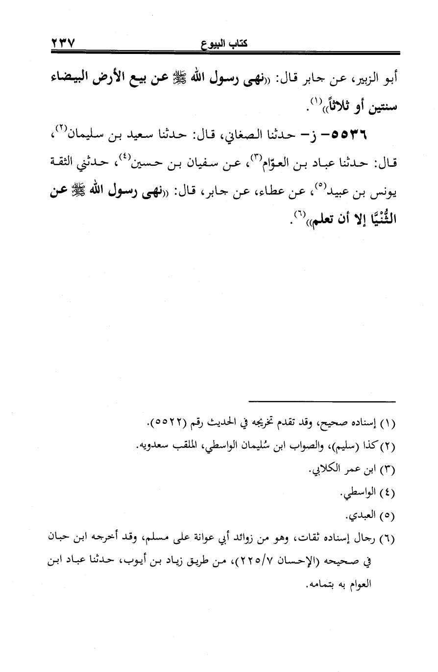 5536 - ز- حدثنا الصغاني، قال: حدثنا سعيد بن سليمان (¬1)، قال: حدثنا عباد بن العوّام (¬2)، عن سفيان بن حسين (¬3)، حدثني الثقة يونس بن عبيد (¬4)، عن عطاء، عن جابر، قال: "نهي رسول الله -صلى الله عليه وسلم- عن الثُّنْيَّا إلا أن تعلم" (¬5).