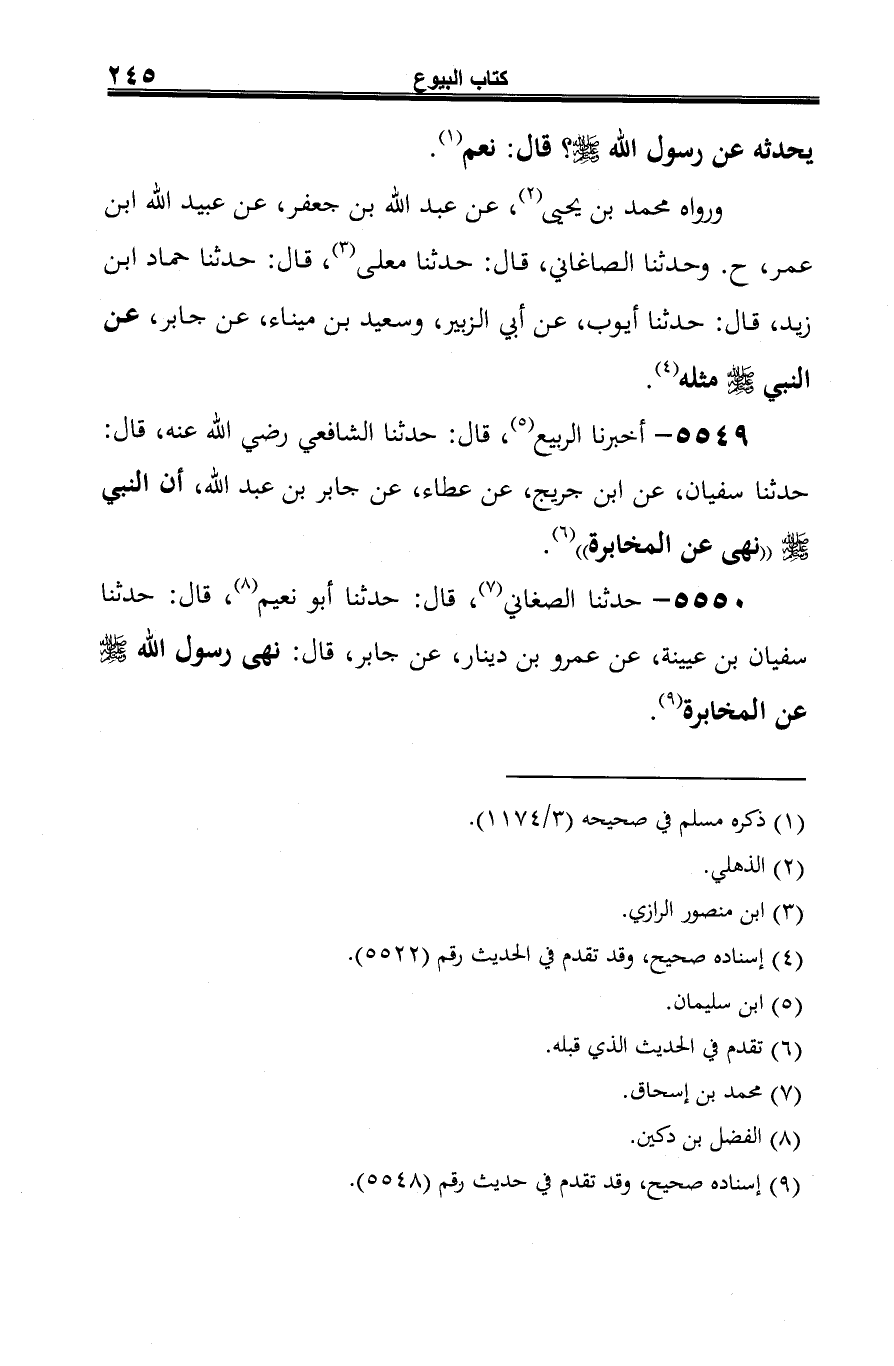 5550 - حدثنا الصغاني (¬1)، قال: حدثنا أبو نعيم (¬2)، قال: حدثنا سفيان بن عيينة، عن عمرو بن دينار، عن جابر، قال: نهي رسول الله -صلى الله عليه وسلم- عن المخابرة (¬3).
