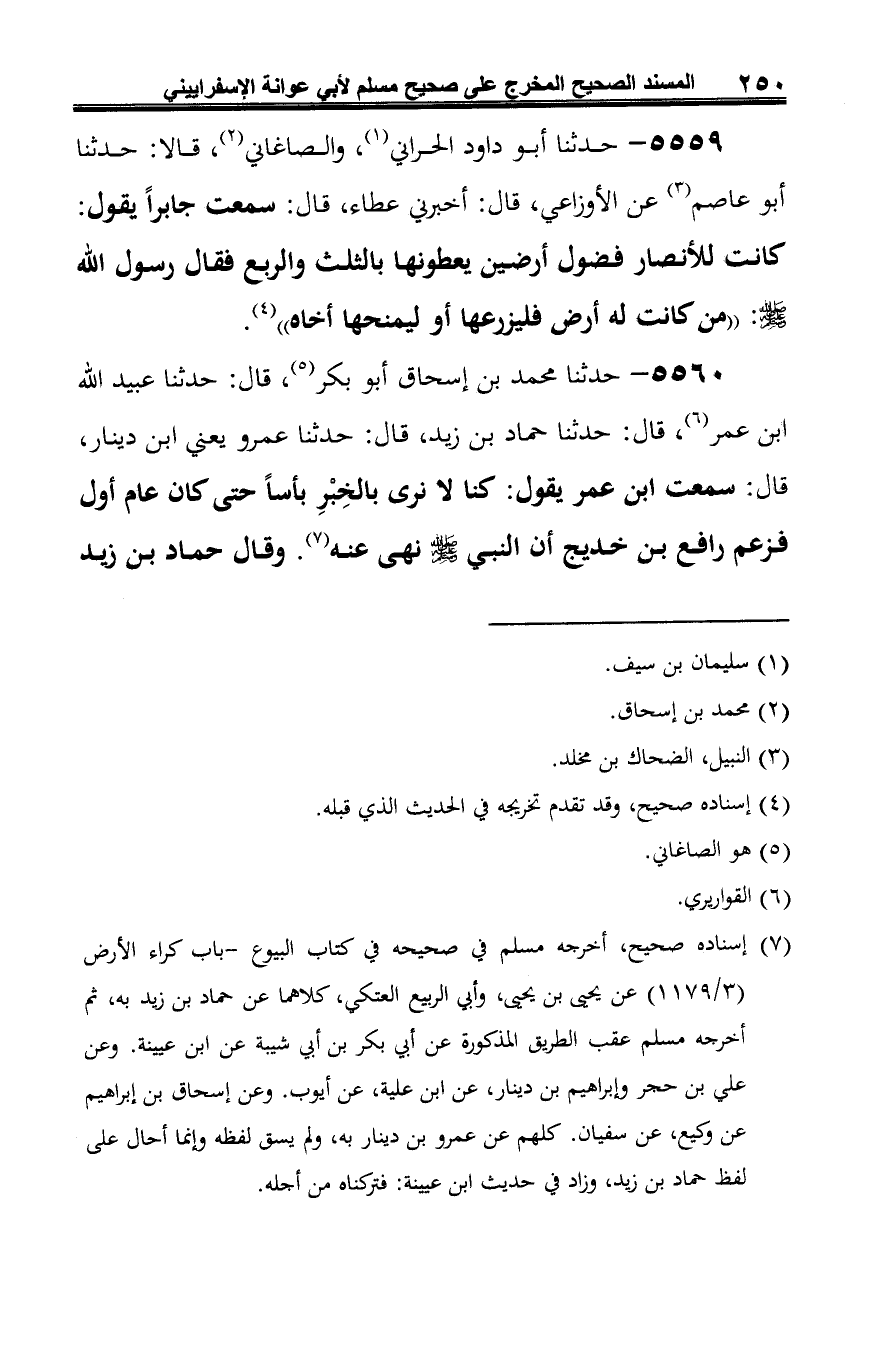 5559 - حدثنا أبو داود الحراني (¬1)، والصاغاني (¬2)، قالا: حدثنا أبو عاصم (¬3) عن الأوزاعي، قال: أخبرني عطاء، قال: سمعت جابرًا يقول: كانت للأنصار فضول أرضين يعطونها بالثلث والربع فقال رسول الله -صلى الله عليه وسلم-: "من كانت له أرض فليزرعها أو ليمنحها أخاه" (¬4).