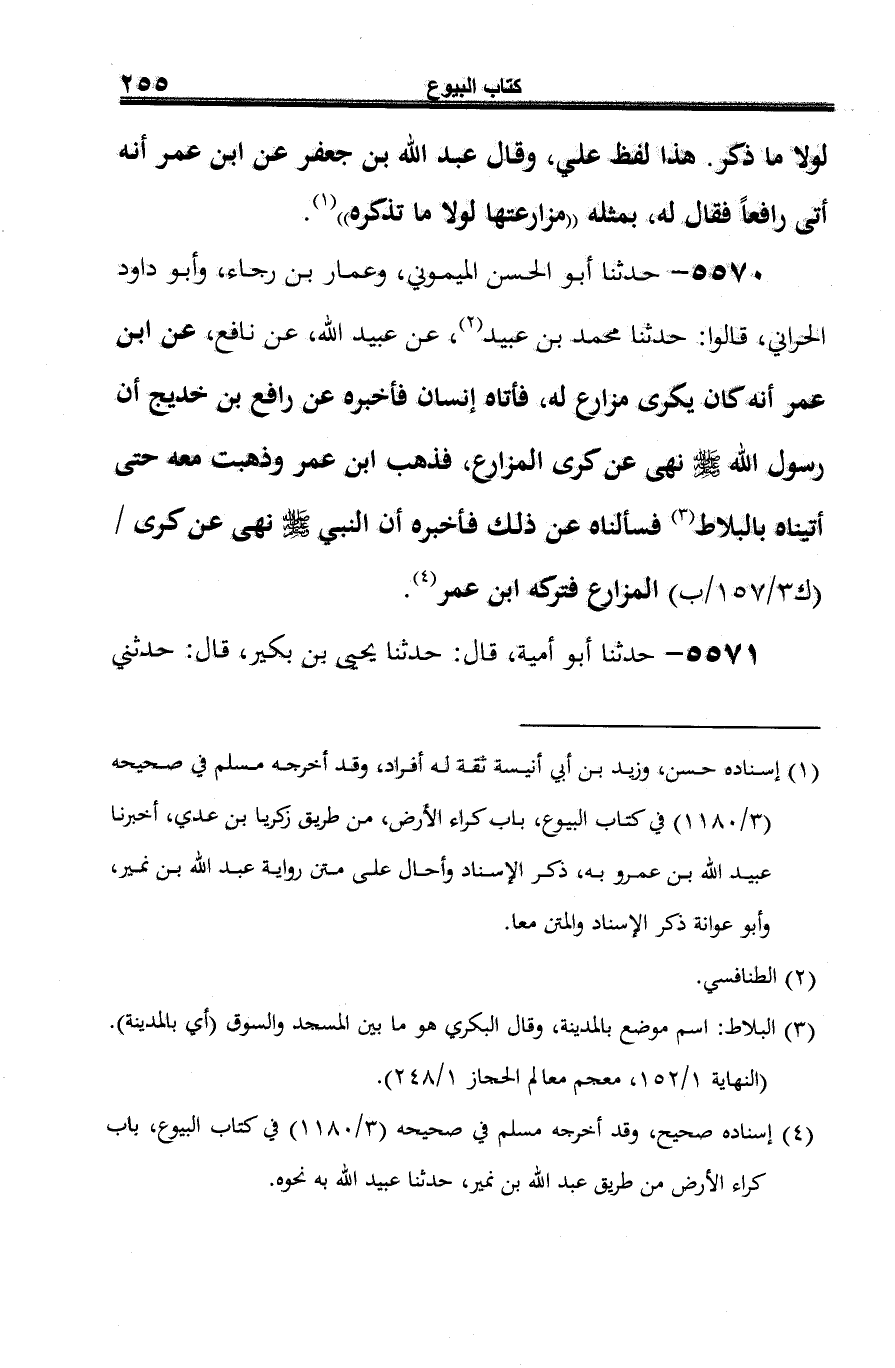 5570 - حدثنا أبو الحسن الميموني، وعمار بن رجاء، وأبو داود الحراني، قالوا: حدثنا محمد بن عبيد (¬1)، عن عبيد الله، عن نافع، عن ابن عمر أنه كان يكرى مزارع له، فأتاه إنسان فأخبره عن رافع بن خديج أن رسول الله -صلى الله عليه وسلم- نهى عن كرى المزارع، فذهب ابن عمر وذهبت معه حتى أتيناه بالبلاط (¬2) فسألناه عن ذلك فأخبره أن النبي -صلى الله عليه وسلم- نهى عن كرى المزارع فتركه ابن عمر (¬3).