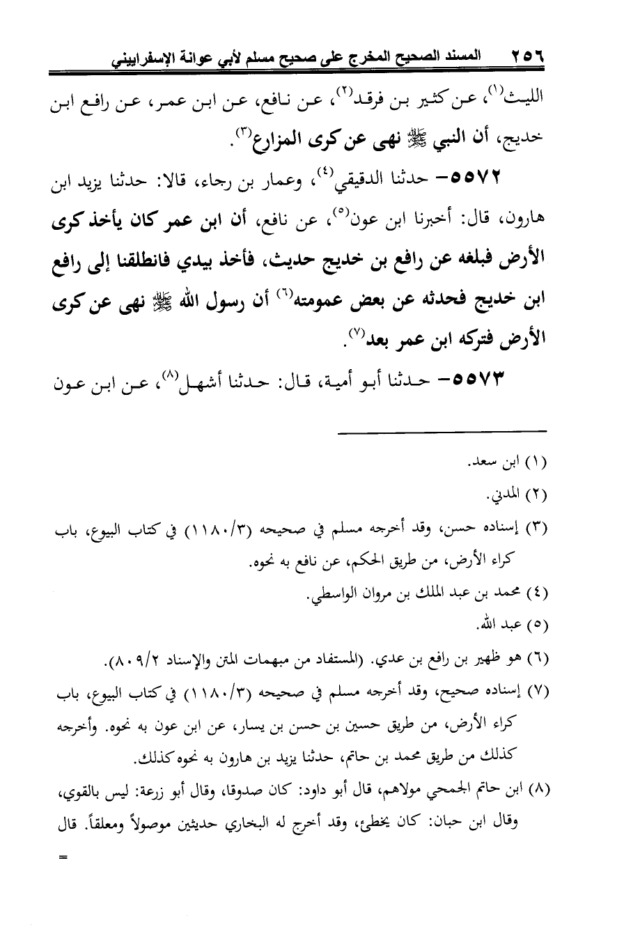 5572 - حدثنا الدقيقي (¬1)، وعمار بن رجاء، قالا: حدثنا يزيد ابن هارون، قال: أخبرنا ابن عون (¬2)، عن نافع، أن ابن عمر كان يأخذ كرى الأرض فبلغه عن رافع بن خديج حديث، فأخذ بيدي فانطلقنا إلى رافع ابن خديج فحدثه عن بعض عمومته (¬3) أن رسول الله -صلى الله عليه وسلم- نهى عن كرى الأرض فتركه ابن عمر بعد (¬4).