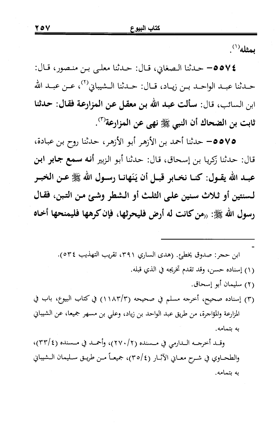 5574 - حدثنا الصغاني، قال: حدثنا معلى بن منصور، قال: حدثنا عبد الواحد بن زياد، قال: حدثنا الشيباني (¬1)، عن عبد الله ابن السائب، قال: سألت عبد الله بن معقل عن المزارعة فقال: حدثنا ثابت بن الضحاك أن النبي -صلى الله عليه وسلم- نهى عن المزارعة (¬2).