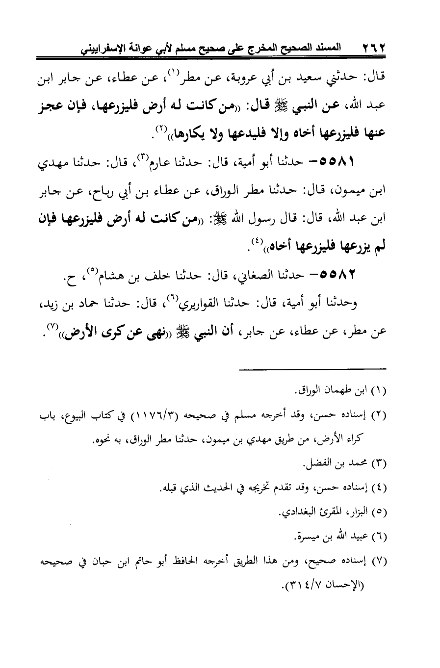 5581 - حدثنا أبو أمية، قال: حدثنا عارم (¬1)، قال: حدثنا مهدي ابن ميمون، قال: حدثنا مطر الوراق، عن عطاء بن أبي رباح، عن جابر ابن عبد الله، قال: قال رسول الله -صلى الله عليه وسلم-: "من كانت له أرض فليزرعها فإن لم يزرعها فليزرعها أخاه" (¬2).