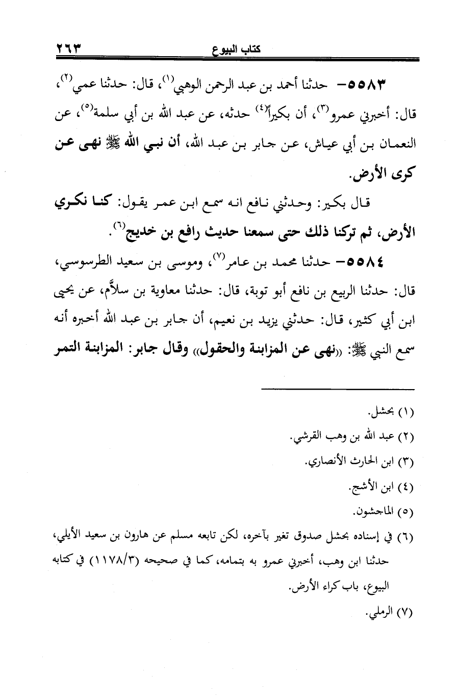 5583 - حدثنا أحمد بن عبد الرحمن الوهبي (¬1)، قال: حدثنا عمي (¬2)، قال: أخبرني عمرو (¬3)، أن بكيرا (¬4) حدثه، عن عبد الله بن أبي سلمة (¬5)، عن النعمان بن أبي عياش، عن جابر بن عبد الله، أن نبي الله -صلى الله عليه وسلم- نهى عن كرى الأرض.