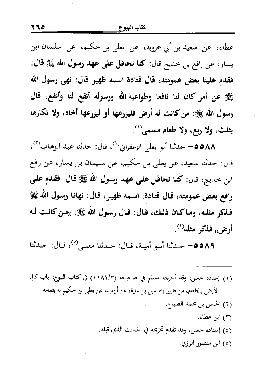 5588 - حدثنا أبو يعلى الزعفراني (¬1)، قال: حدثنا عبد الوهاب (¬2)، قال: حدثنا سعيد، عن يعلى بن حكيم، عن سليمان بن يسار، عن رافع ابن خديج، قال: كنا نحاقل على عهد رسول الله -صلى الله عليه وسلم- قال: فقدم على رافع بعض عمومته، قال قتادة: اسمه ظهير، قال: نهانا رسول الله -صلى الله عليه وسلم- فذكر مثله، وما كان ذلك، قال: قال رسول الله -صلى الله عليه وسلم-: "من كانت له أرض" فذكر مثله (¬3).
