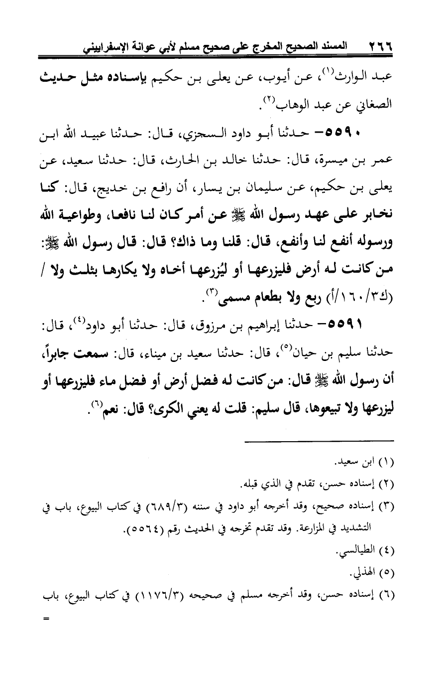 5590 - حدثنا أبو داود السجزي، قال: حدثنا عبيد الله ابن عمر بن ميسرة، قال: حدثنا خالد بن الحارث، قال: حدثنا سعيد، عن يعلى بن حكيم، عن سليمان بن يسار، أن رافع بن خديج، قال: كنا نخابر على عهد رسول الله -صلى الله عليه وسلم- عن أمر كان لنا نافعا، وطواعية الله ورسوله أنفع لنا وأنفع، قال: قلنا وما ذاك؟ قال: قال رسول الله -صلى الله عليه وسلم-: من كانت له أرض فليزرعها أو ليُزرعها أخاه ولا يكارها بثلث ولا ربع ولا بطعام مسمى (¬1).