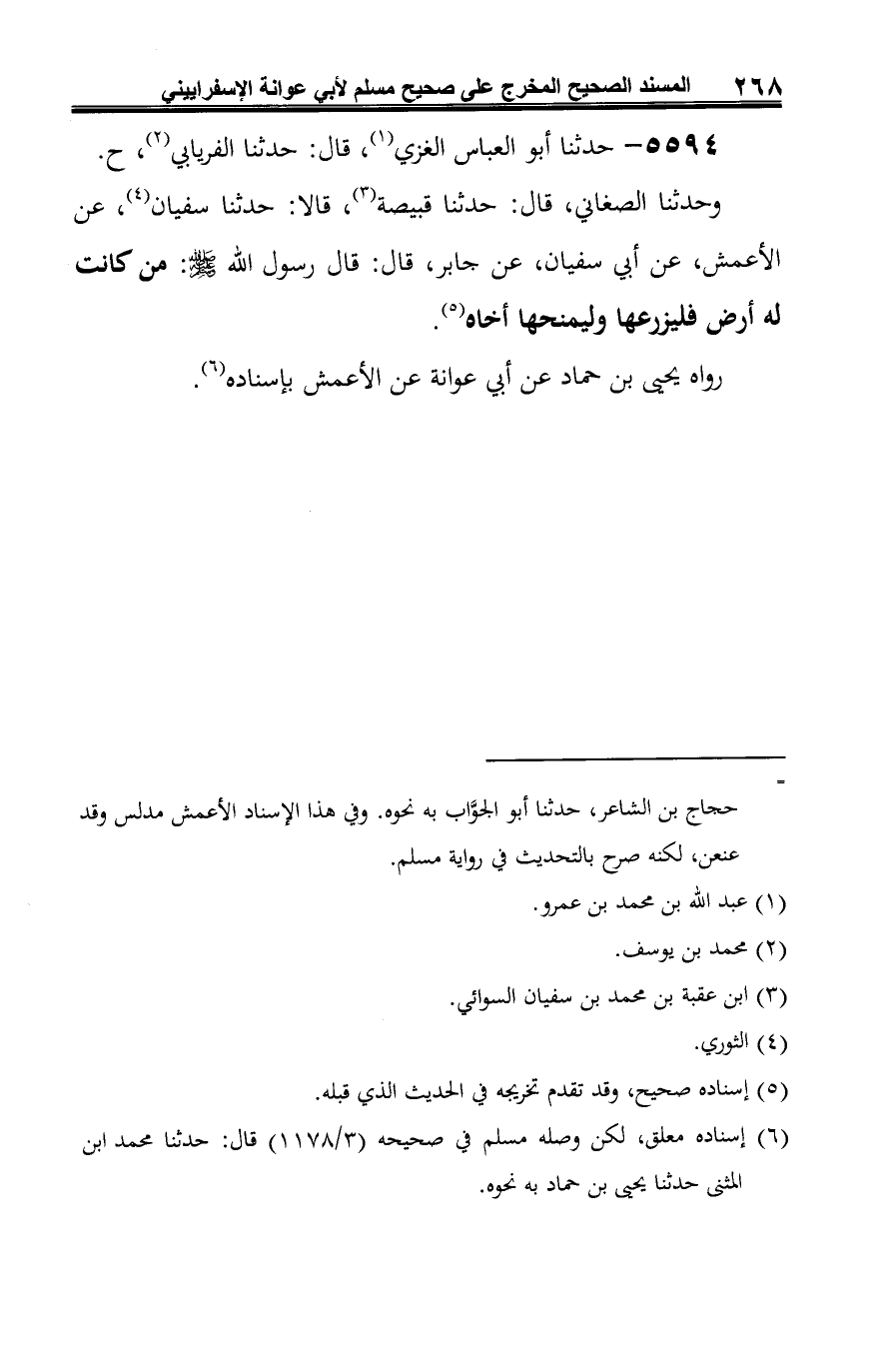 وحدثنا الصغاني، قال: حدثنا قبيصة (¬3)، قالا: حدثنا سفيان (¬4)، عن الأعمش، عن أبي سفيان، عن جابر، قال: قال رسول الله -صلى الله عليه وسلم-: من كانت له أرض فليزرعها وليمنحها أخاه (¬5).