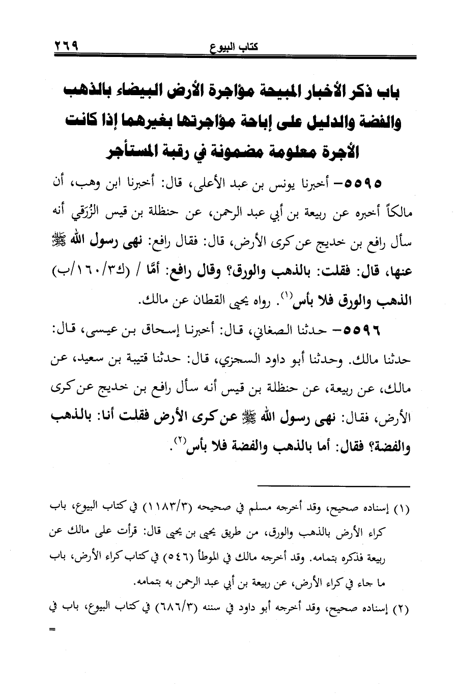 5596 - حدثنا الصغاني، قال: أخبرنا إسحاق بن عيسى، قال: حدثنا مالك. وحدثنا أبو داود السجزي، قال: حدثنا قتيبة بن سعيد، عن مالك، عن ربيعة، عن حنظلة بن قيس أنه سأل رافع بن خديج عن كرى الأرض، فقال: نهى رسول الله -صلى الله عليه وسلم- عن كرى الأرض فقلت أنا: بالذهب والفضة؟ فقال: أما بالذهب والفضة فلا بأس (¬1).