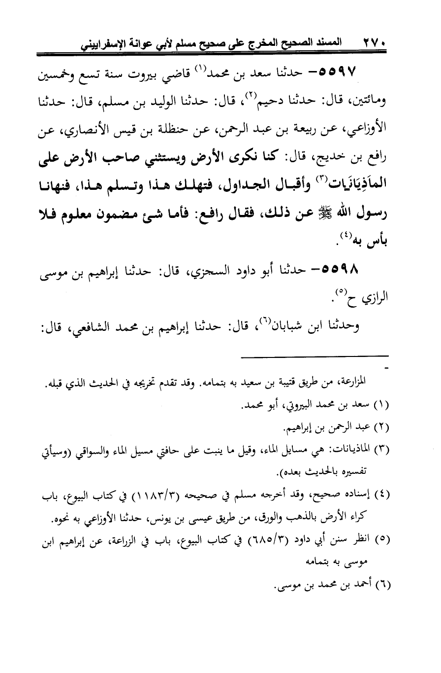 5597 - حدثنا سعد بن محمد (¬1) قاضي بيروت سنة تسع وخمسين ومائتين، قال: حدثنا دحيم (¬2)، قال: حدثنا الوليد بن مسلم، قال: حدثنا الأوزاعي، عن ربيعة بن عبد الرحمن، عن حنظلة بن قيس الأنصاري، عن رافع بن خديج، قال: كنا نكرى الأرض ويستثني صاحب الأرض على الماَذِيَانات (¬3) وأقبال الجداول، فتهلك هذا وتسلم هذا، فنهانا رسول الله -صلى الله عليه وسلم- عن ذلك، فقال رافع: فأما شيء مضمون معلوم فلا بأس به (¬4).