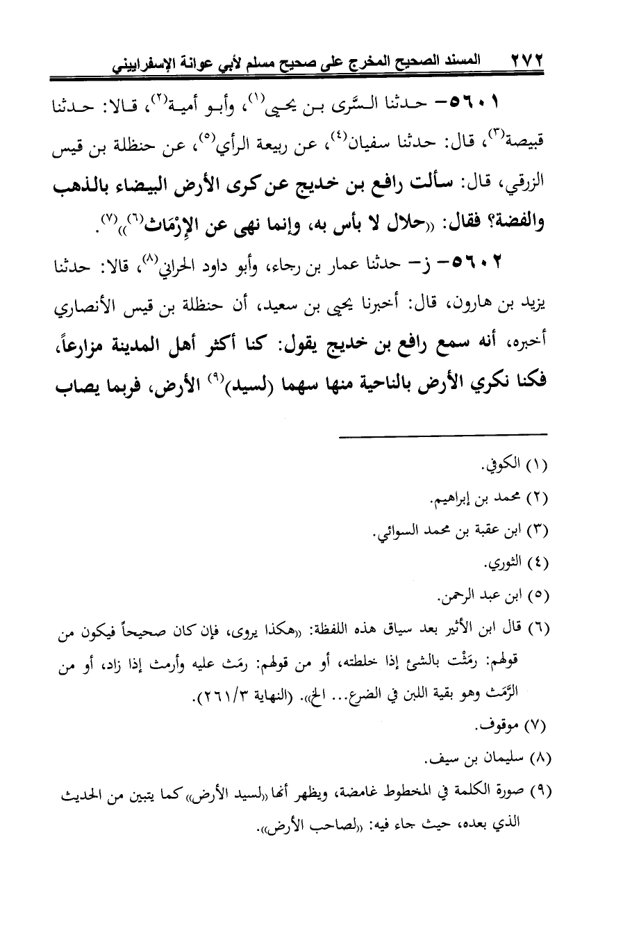 5601 - حدثنا السَّرى بن يحيى (¬1)، وأبو أمية (¬2)، قالا: حدثنا قبيصة (¬3)، قال: حدثنا سفيان (¬4)، عن ربيعة الرأي (¬5)، عن حنظلة بن قيس الزرقي، قال: سألت رافع بن خديج عن كرى الأرض البيضاء بالذهب والفضة؟ فقال: "حلال لا بأس به، وإنما نهي عن الإِرْمَاث (¬6) " (¬7).