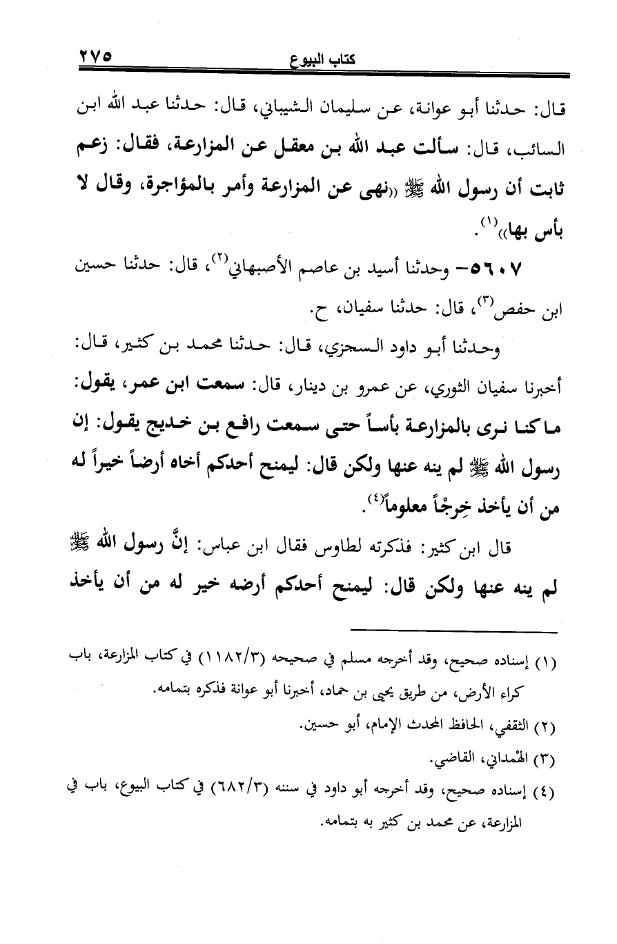 وحدثنا أبو داود السجزي، قال: حدثنا محمد بن كثير، قال: أخبرنا سفيان الثوري، عن عمرو بن دينار، قال: سمعت ابن عمر، يقول: ما كنا نرى بالمزارعة بأسًا حتى سمعت رافع بن خديج يقول: إن رسول الله -صلى الله عليه وسلم- لم ينه عنها ولكن قال: ليمنح أحدكم أخاه أرضًا خيرًا له من أن يأخذ خِرجًا معلومًا (¬3).