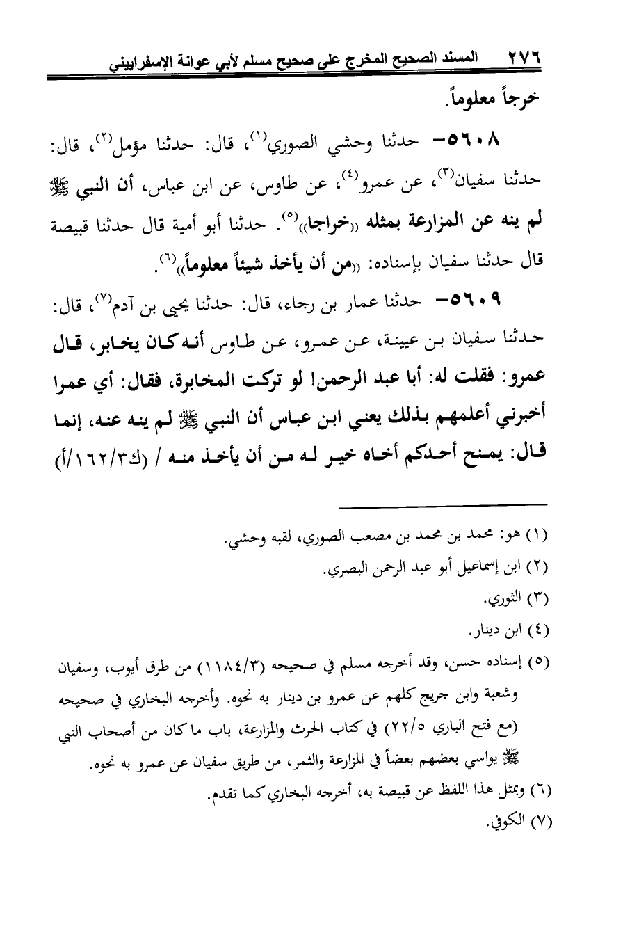 5608 - حدثنا وحشي الصوري (¬1)، قال: حدثنا مؤمل (¬2)، قال: حدثنا سفيان (¬3)، عن عمرو (¬4)، عن طاوس، عن ابن عباس، أن النبي -صلى الله عليه وسلم- لم ينه عن المزارعة بمثله "خراجا" (¬5). حدثنا أبو أمية قال حدثنا قبيصة قال حدثنا سفيان بإسناده: "من أن يأخذ شيئًا معلومًا" (¬6).
