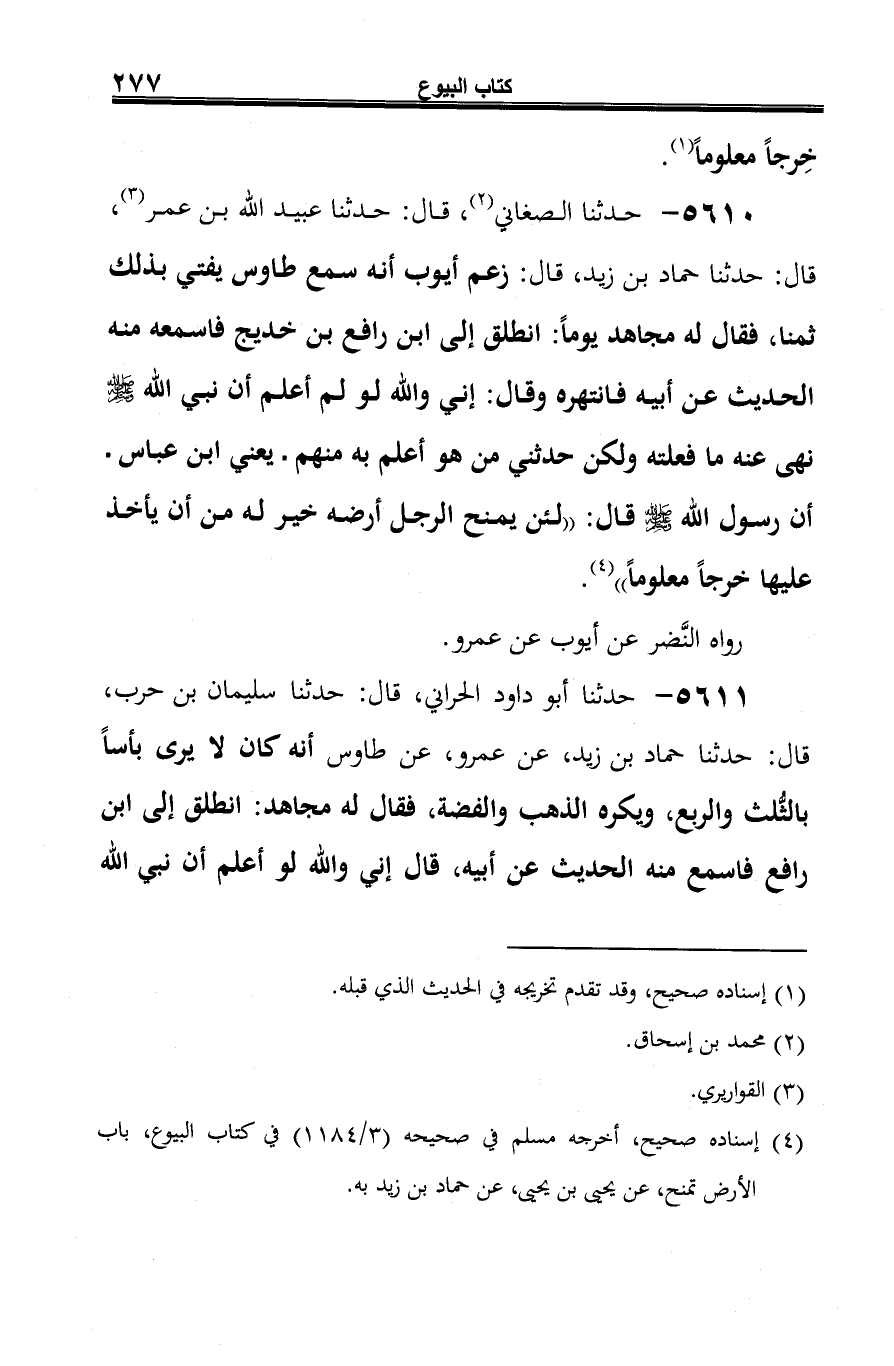 5610 - حدثنا الصغاني (¬1)، قال: حدثنا عبيد الله بن عمر (¬2)، قال: حدثنا حماد بن زيد، قال: زعم أيوب أنه سمع طاوس يفتي بذلك ثمنا، فقال له مجاهد يومًا: انطلق إلى ابن رافع بن خديج فاسمعه منه الحديث عن أبيه فانتهره وقال: إني والله لو لم أعلم أن نبي الله -صلى الله عليه وسلم- نهى عنه ما فعلته ولكن حدثني من هو أعلم به منهم -يعني ابن عباس- أن رسول الله -صلى الله عليه وسلم- قال: "لئن يمنح الرجل أرضه خير له من أن يأخذ عليها خرجًا معلومًا" (¬3).