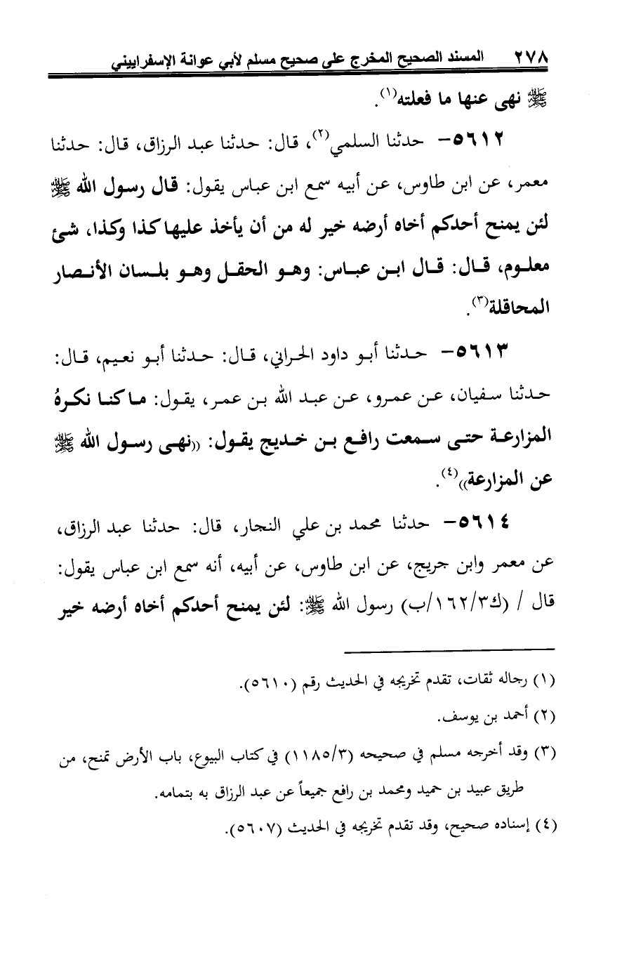 5614 - حدثنا محمد بن علي النجار، قال: حدثنا عبد الرزاق، عن معمر وابن جريج، عن ابن طاوس، عن أبيه، أنه سمع ابن عباس يقول: قال رسول الله -صلى الله عليه وسلم-: لئن يمنح أحدكم أخاه أرضه خير