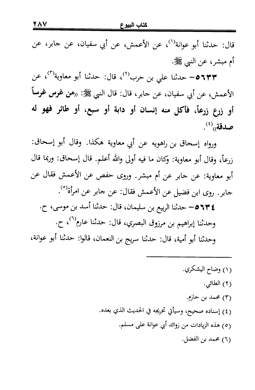 5633 - حدثنا علي بن حرب (¬1)، قال: حدثنا أبو معاوية (¬2)، عن الأعمش، عن أبي سفيان، عن جابر، قال: قال النبي -صلى الله عليه وسلم-: "من غرس غرسًا أو زرع زرعًا، فأكل منه إنسان أو دابة أو سبع، أو طائر فهو له صدقة" (¬3).