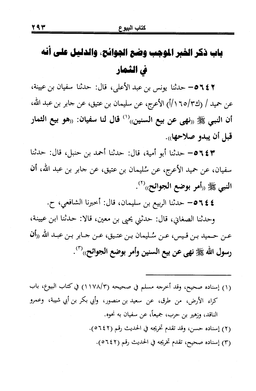 وحدثنا الصغاني، قال: حدثني يحيى بن معين، قالا: حدثنا ابن عيينة، عن حميد بن قيس، عن سُليمان بن عتيق، عن جابر بن عبد الله "أن رسول الله -صلى الله عليه وسلم- نهى عن بيع السنين وأمر بوضع الجوائح" (¬1).