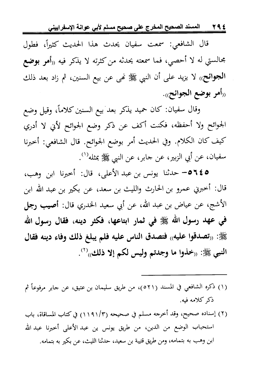 5645 - حدثنا يونس بن عبد الأعلى، قال: أخبرنا ابن وهب، قال: أخبرني عمرو بن الحارث والليث بن سعد، عن بكير بن عبد الله ابن الأشج، عن عياض بن عبد الله، عن أبي سعيد الخدري قال: أصيب رجل في عهد رسول الله -صلى الله عليه وسلم- في ثمار ابتاعها، فكثر دينه، فقال رسول الله -صلى الله عليه وسلم-: "تصدقوا عليه" فتصدق الناس عليه فلم يبلغ ذلك وفاء دينه فقال النبي -صلى الله عليه وسلم-: "خذوا ما وجدتم وليس لكم إلا ذلك" (¬1).
