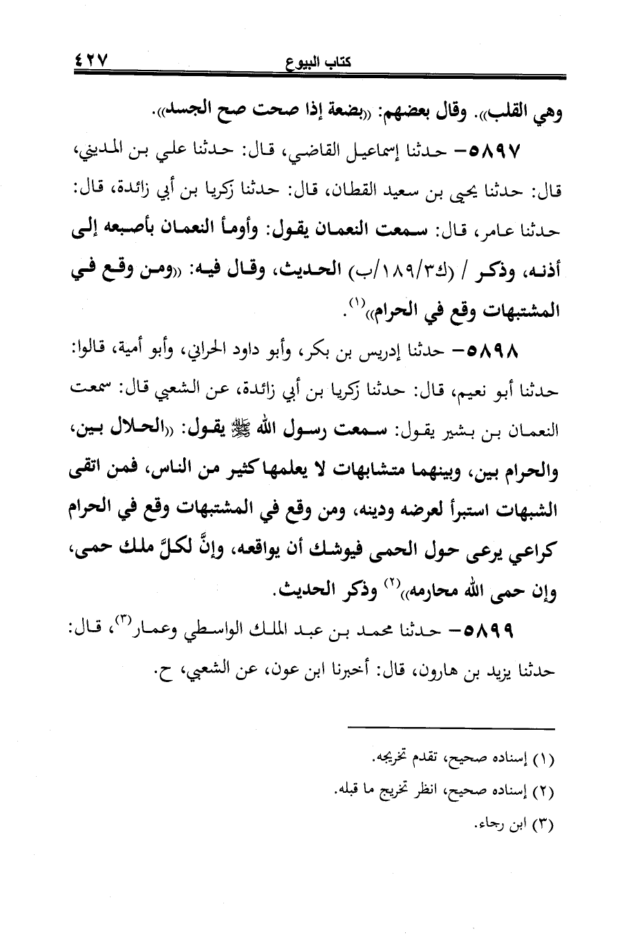 5897 - حدثنا إسماعيل القاضي، قال: حدثنا علي بن المديني، قال: حدثنا يحيى بن سعيد القطان، قال: حدثنا زكريا بن أبي زائدة، قال: حدثنا عامر، قال: سمعت النعمان يقول: وأومأ النعمان بأصبعه إلى أذنه، وذكر الحديث، وقال فيه: "ومن وقع في المشتبهات وقع في الحرام" (¬1).