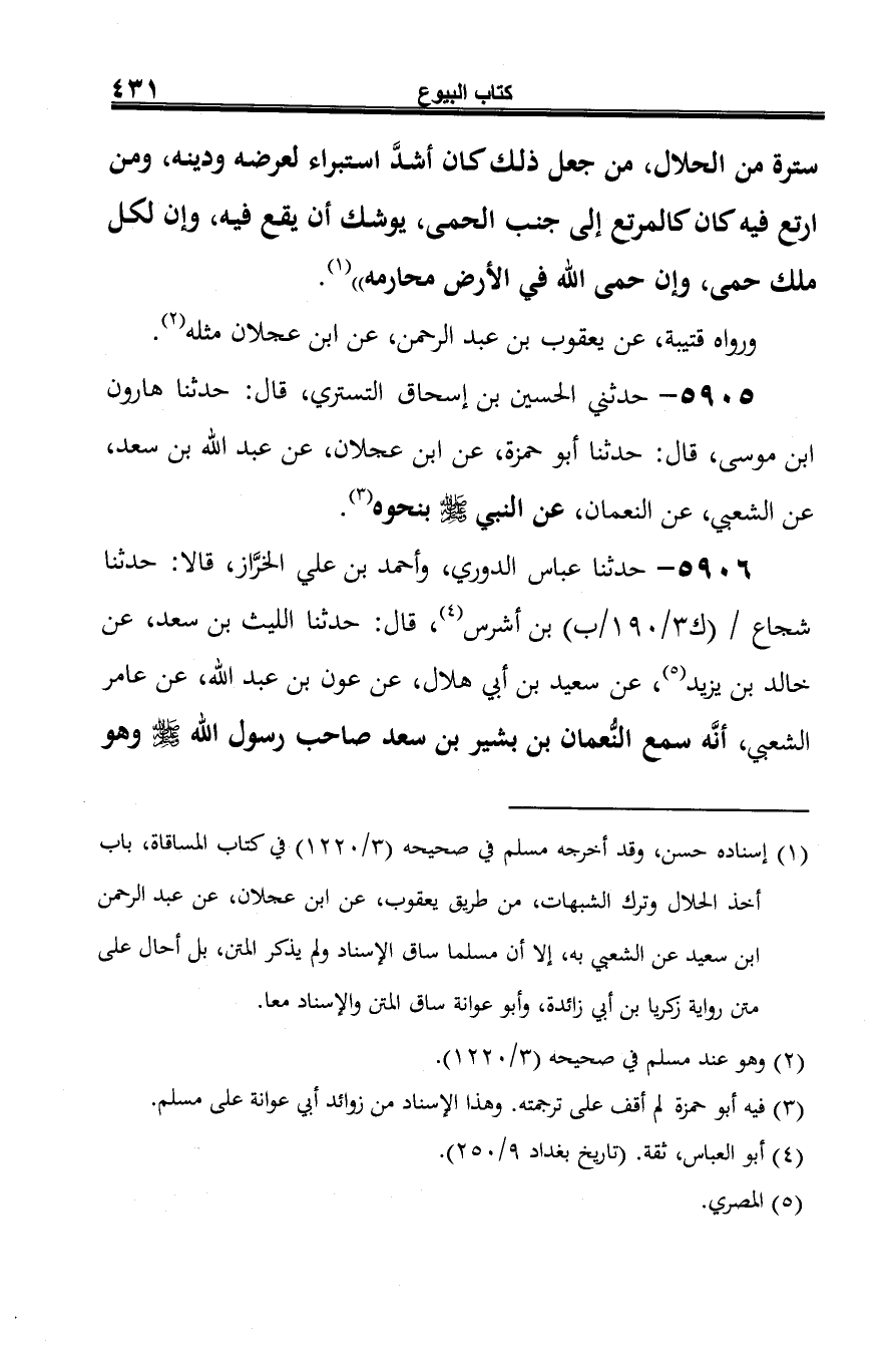 -[432]- يخطب الناس بحمص وهو يقول: سمعت رسول الله -صلى الله عليه وسلم- يقول: "الحلال بين، والحرام بين، وبين ذلك أمور مشتبهات، فمن ترك ذلك فهو أسلم لدينه ولعرضه، ومن وقع فيهن فيوشك أن يقع في الحرام، كالمرتع إلى جانب الحمى يوشك أن يقع فيه" (¬3).