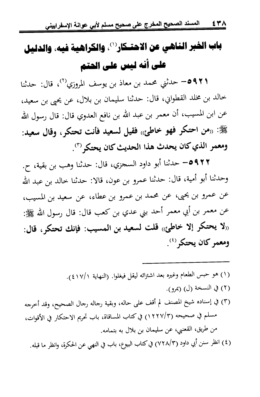 (¬2) في إسناده شيخ المصنف لم أقف على حاله، وبقية رجاله رجال الصحيح، وقد أخرجه مسلم في صحيحه (3/ 1227) في كتاب المساقاة، باب تحريم الاحتكار في الأقوات، من طريق، القعنبي، عن سليمان بن بلال به بتمامه.