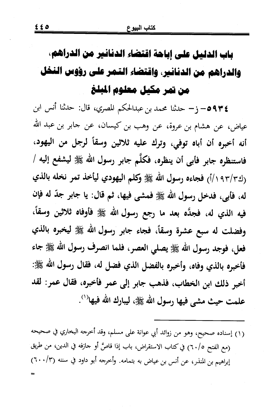 5934 - ز - حدثنا محمد بن عبد الحكم المصري، قال: حدثنا أنس ابن عياض، عن هشام بن عروة، عن وهب بن كيسان، عن جابر بن عبد الله أنه أخبره أن أباه توفي، وترك عليه ثلاثين وسقًا لرجل من اليهود، فاستنظره جابر فأبى أن ينظره، فكلَّم جابر رسول الله صلى الله عليه وسلم ليشفع إليه فجاءه رسول الله -صلى الله عليه وسلم- وكلم اليهودي ليأخذ تمر نخله بالذي له، فأبى، فدخل رسول الله صلى الله عليه وسلم فمشى فيها، ثم قال: يا جابر جدّ له فإن فيه الذي له، فجدَّه بعد ما رجع رسول الله صلى الله عليه وسلم فأوفاه ثلاثين وسقًا، وفضلت له سبع عشرة وسقًا، فجاء جابر رسول الله صلى الله عليه وسلم ليخبره بالذي فعل، فوجد رسول الله صلى الله عليه وسلم يصلي العصر، فلما انصرف رسول الله صلى الله عليه وسلم جاء فأخبره بالذي وفاه، وأخبره بالفضل الذي فضل له، فقال رسول الله صلى الله عليه وسلم: أخبر ذلك ابن الخطاب، فذهب جابر إلى عمر فأخبره، فقال عمر: لقد علمت حيث مشى فيها رسول الله صلى الله عليه وسلم، ليبارك الله فيها (¬1).