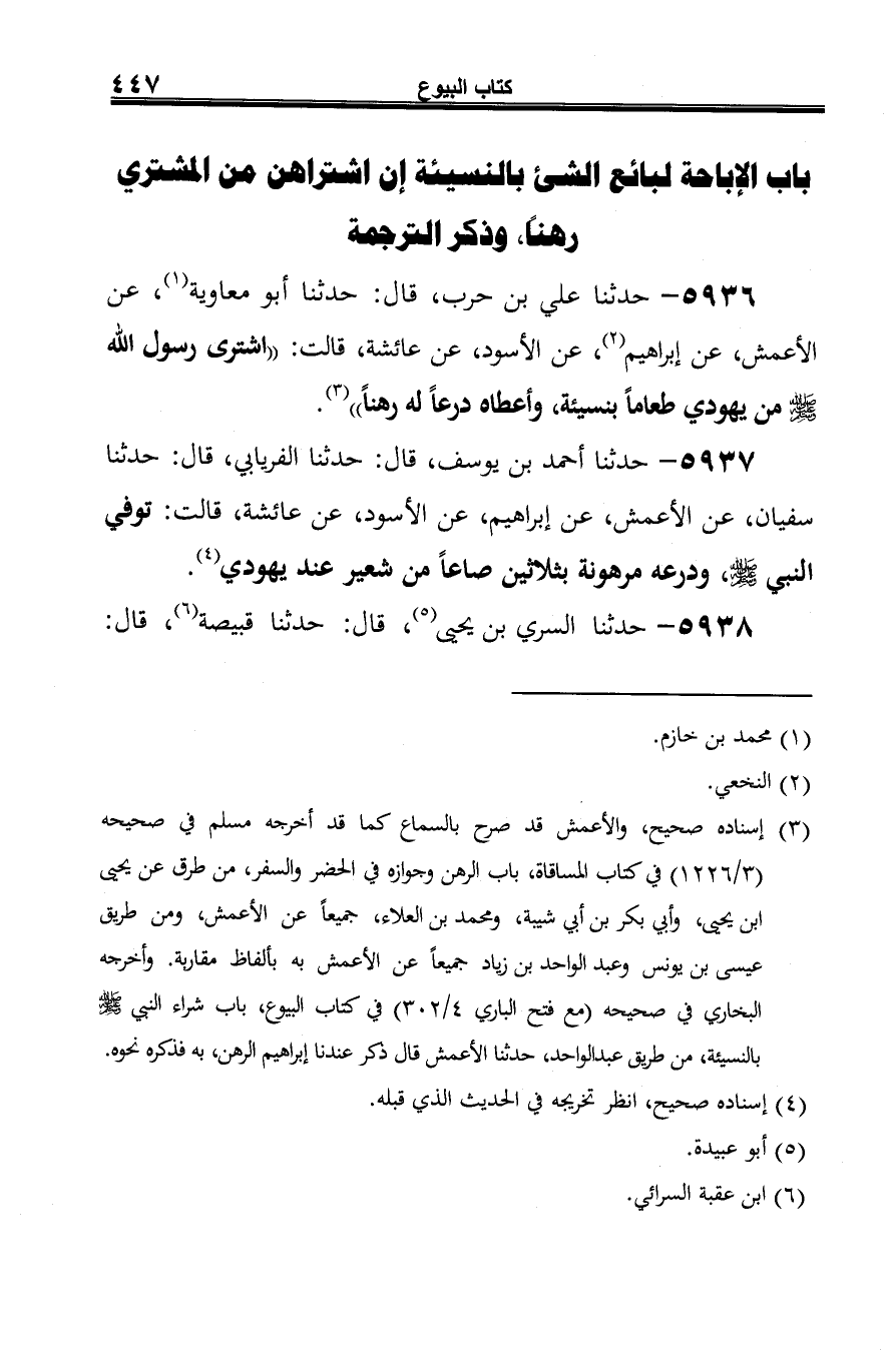 5936 - حدثنا علي بن حرب، قال: حدثنا أبو معاوية (¬1)، عن الأعمش، عن إبراهيم (¬2)، عن الأسود، عن عائشة، قالت: "اشترى رسول الله -صلى الله عليه وسلم- من يهودي طعامًا بنسيئة، وأعطاه درعًا له رهنًا" (¬3).
