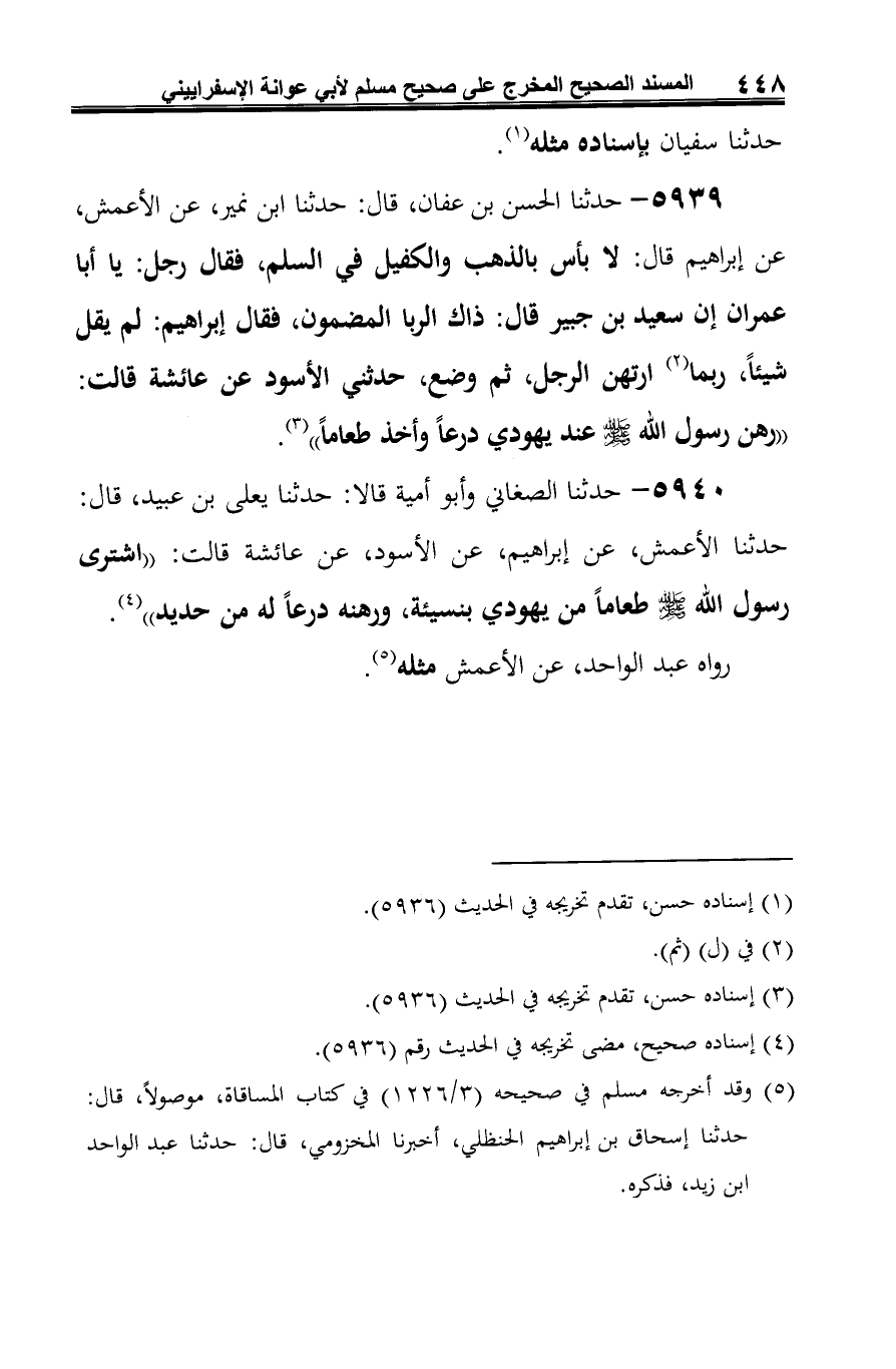 5940 - حدثنا الصغاني وأبو أمية قالا: حدثنا يعلى بن عبيد، قال: حدثنا الأعمش، عن إبراهيم، عن الأسود، عن عائشة قالت: "اشترى رسول الله صلى الله عليه وسلم طعامًا من يهودي بنسيئة، ورهنه درعًا له من حديد" (¬1).