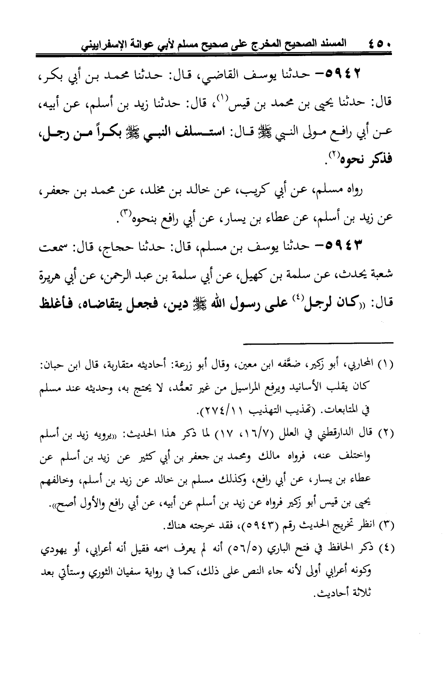 (¬4) إسناده صحيح، وقد أخرجه مسلم في صحيحه (3/ 1225) في كتاب المساقاة، باب من استسلف شيئًا فقضى خيرًا منه، من طرق عن محمد بن جعفر، عن شعية وعلي بن صالح، وسفيان جميعًا عن سلمة بن كهيل به نحوه، وأخرجه البخاري في صحيحه (مع فتح الباري 5/ 56) في كتاب الاستقراض، باب استقراض الإبل، من طريق أبي الوليد، حدثنا شعبة به فذكر نحوه.
