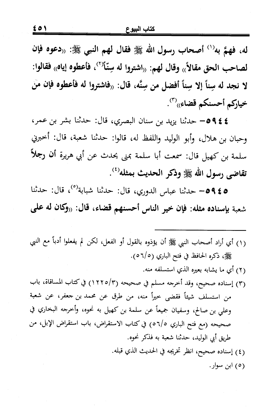 5945 - حدثنا عباس الدوري، قال: حدثنا شبابة (¬1)، قال: حدثنا شعبة بإسناده مثله: فإن خير الناس أحسنهم قضاء، قال: "وكان له على